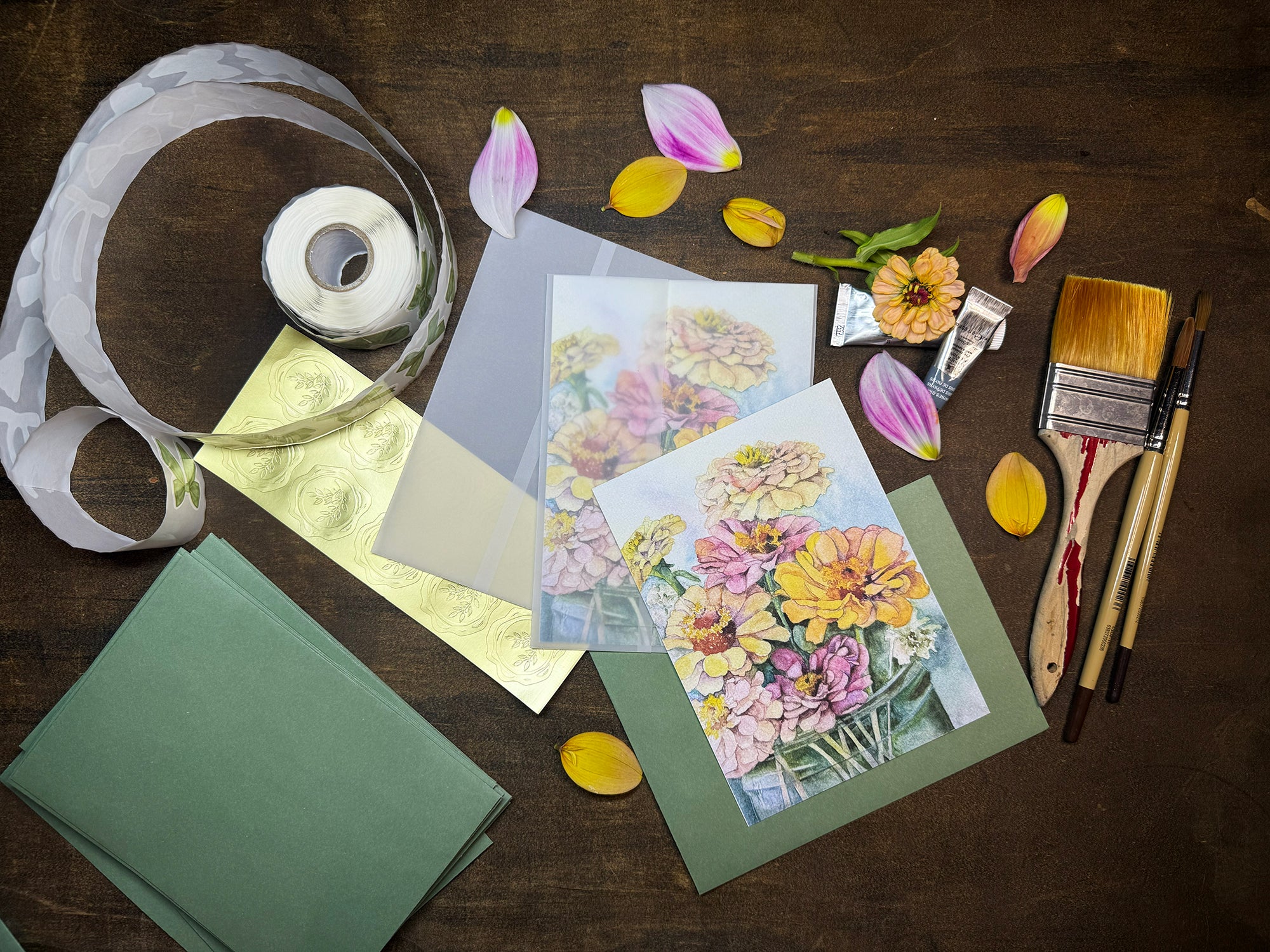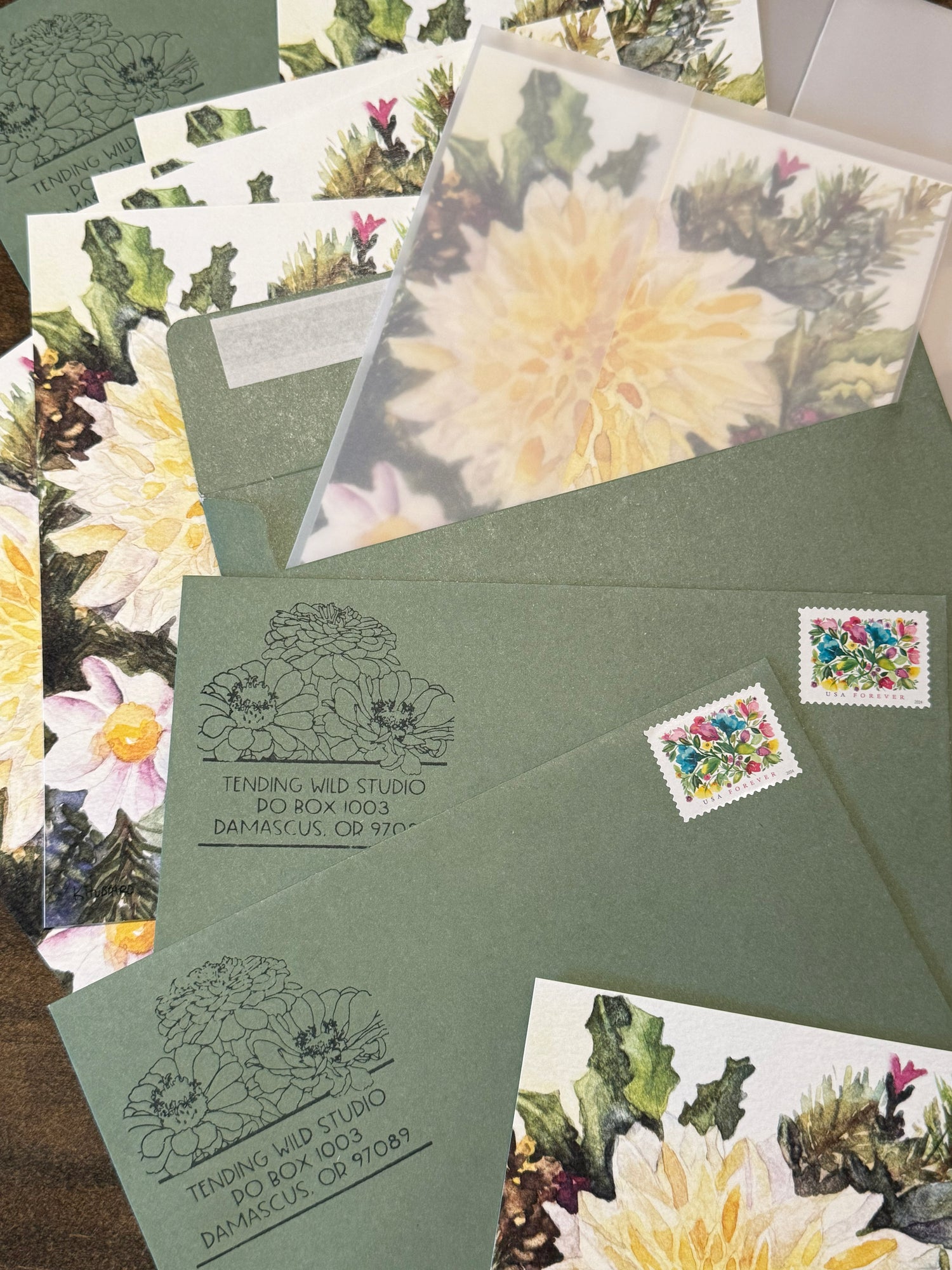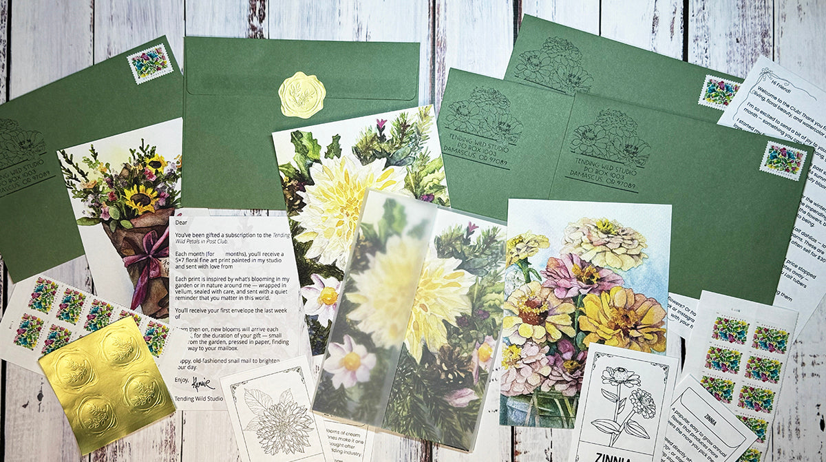 Inside: a 5×7 fine art print, a seed card with a line drawing of that month’s bloom, and a note from the studio.