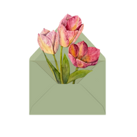 A vellum wrapper, tucked into a green envelope with a first-class stamp